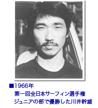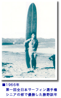 そして、1966年第一回全日本サーフィン選手権が、千葉の鴨川で開催される。板の長さは10ft、3m近くで、重さは12kgもあった。ジュニア(20才まで)の部とシニア(20才以上)の部の2クラスに分けて競った。地元鴨川の川井幹雄、勝野訓年がそれぞれの部で優勝し、川井幹雄は翌年67年と68年と続けて同大会で優勝し3連覇と言う偉業を成し遂げた。