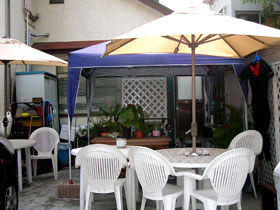 | 海岸側はウッドデッキとサーフボードが目立つ。 |