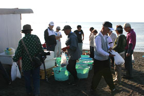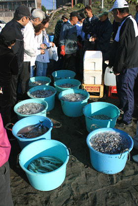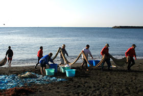 | 中海岸辺りの地引き網漁。水揚げあと。 |