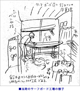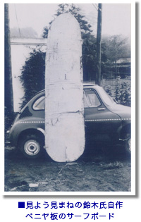 そして立ち上がり、波を乗り継ぐ姿…。かつての絵葉書ではイメージできなかったことが、 現実として目の前で展開する。 その瞬間から鈴木氏のサーフィンの長い歴史が始まる。やがて、帰国するその米兵からボードを買い取り、 ボード作りの研究材料にする。初めは硬質発砲スチロールをシェイプして新聞紙を巻き、 樹脂で固めるという方法であった。しかし、重さが15kgにも達し失敗に終わる。 やっと本物に近いサーフボードができたのはウレタン素材の発見であった。家庭製品用に作られた90cm立方体のブロック3個をボンドで繋ぎ合わせ、 ストリンガーを入れ、約2m70cmの長さの固まりにしてから削り出した。 かくしてフォーム、樹脂、ストリンガーと素材が整い、サーフボードと言えるものがこの時始めて完成した。