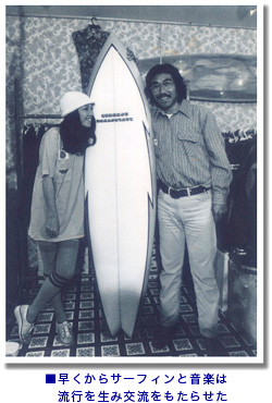あらゆるカルチャーがアメリカからやってきた1960年代。サーフィンも例外でなく、全国でも有数のリゾート地として知られるこの湘南にサーフィンが持たらせた事により、急速に全国に広まって行く事となる。それには加山雄三や尾崎紀世彦ら湘南を代表するスターが大きく関わっていた。特に茅ヶ崎で「雄三通」と通り名になっている若大将加山雄三氏は、木製サーフボードを自作し茅ヶ崎で遊んでいたが、その時の姿を新聞が紹介し、刺激された湘南の若者達が次々とサーフィンに魅了される事となったのである。スター達と湘南の若者の遊び文化として、最先端カルチャーであり、最新ファッションである現代スポーツとしてマスコミがこぞってサーフィンを取り上げ、爆発的流行として瞬く間に全国にも広まり、現在のように定着していく事になった。